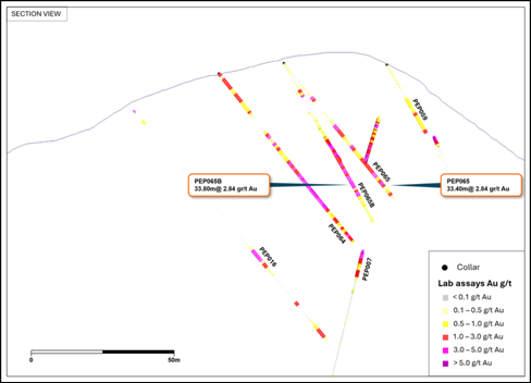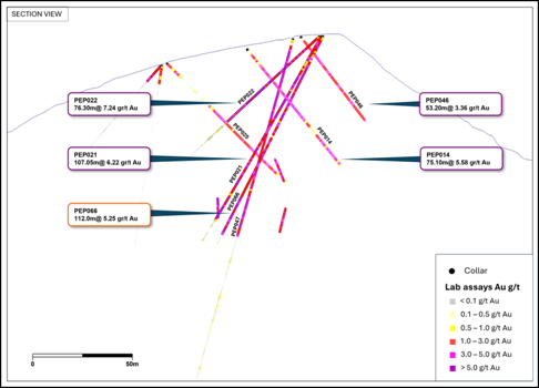 o PEP066 (met hole) - 112m @ 5.25g/t Au from surface