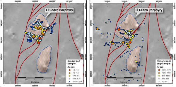 Figure 6. El Cedro, multiple porphyry bodies, soils and rock chips