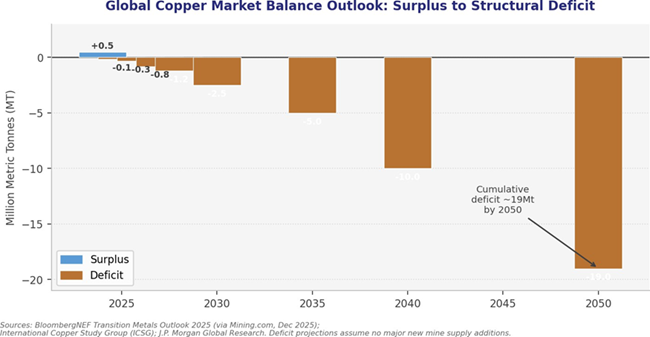 12 J.P. Morgan Global Research, "Copper Market Outlook". Global refined copper deficit projected at ~330,000 MT in 2026.
