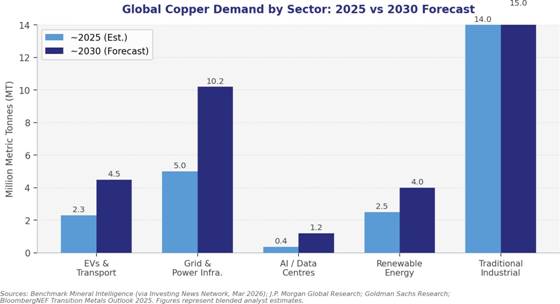 Copper's demand profile is being fundamentally reshaped by three intersecting megatrends: the global energy transition, electrification of transport, and the rapid build-out of artificial intelligence (AI) infrastructure. Electric vehicles (EVs) related copper demand is forecast to grow from approximately 2.3 million MT in 2025 to 6 million MT by 2035.18 Grid upgrades and power infrastructure alone are projected to drive more than 60% of copper demand growth through to 2030.8 Data centre copper demand is anticipated to reach approximately 475,000 MT in 2026, up approximately 110,000 MT year-on-year.9 Bloomberg NEF's Transition Metals Outlook 2025 projects that copper demand tied to the energy transition could triple by 2045, with the market potentially entering a structural deficit as early as 2026.10