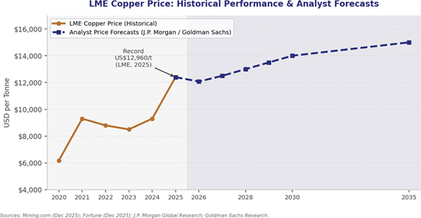 Prices reached an intra-year peak of US$12,960/t on the LME and US$14,527.50/t on COMEX in January 2026.6 Major investment banks have markedly upgraded their price outlooks: J.P. Morgan projects copper to average approximately US$12,075/t in 2026,7 while Goldman Sachs forecasts the LME price will reach US$15,000/t by 2035.8
