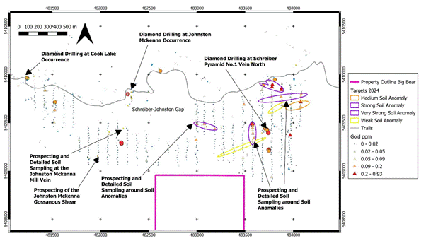 A soil sampling programme was completed collecting 637 samples over the Schreiber-Pyramid, Twomey and Schreiber Johnston Gap areas which are to be submitted to AGAT labs for multi-element assay in the next few days. The programme was designed to generate further exploration and potential drilling prospects, building on the successful 2023 soil sampling programme which displayed a corridor of elevated gold values.