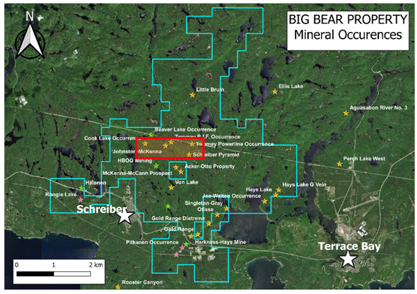 · Four drill ready prospects have been identified with significant gold assays at Schreiber-Pyramid No.1 North and No.1 South, Johnston McKenna and Cook Lake