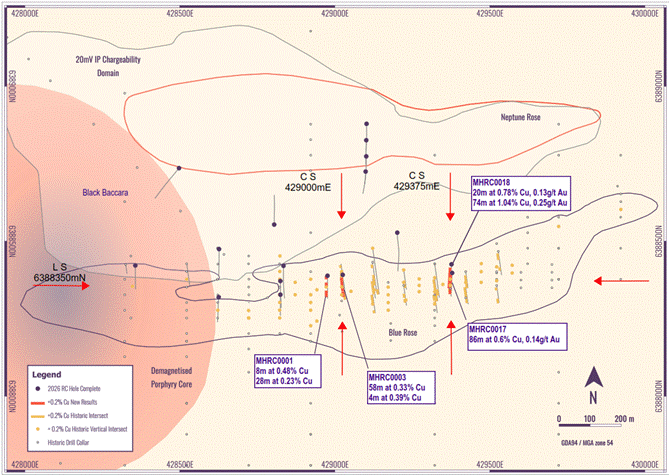 · Drillholes targeting skarn-style mineralisation at Neptune Rose - a geophysical target aligned north of and parallel to Blue Rose.