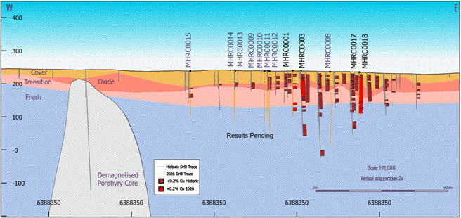 Mineralisation intersected by drillholes MHRC0017 and 0018 has a true width of approximately 70m where downdip continuity appears strong. MHRC0018 is the best primary sulphide result reported from the project.