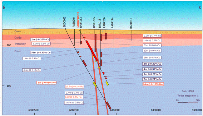 Mineralisation within MHRC0003 shows connectivity between shallow oxide mineralisation within RABR205 that intersected 43m at 0.6% Cu from 12m and diamond drillhole BRDD003 that contains multiple low-grade zones and included: 16.15m at 0.51% Cu, 17.8m at 0.08% Mo from 144.2m, 5.8m at 0.13% Mo from 156.2m and 26.7m at 0.43% Cu from 195m.