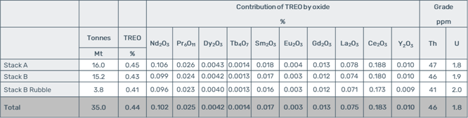 Phalaborwa's MRE has been updated to include yttrium, as presented in the summary table below. The MRE will be available on Rainbow's website in due course.