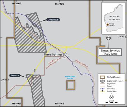 Located within the Mid-West region of Western Australia, near the northern wheatbelt town of Three Springs, the Pitfield titanium project lies 313 km north of Perth and 156 km southeast of Geraldton, the Mid-West region's capital and major port. The Company has now signed a non-binding co-operation agreement with the Mid West Ports Authority, enabling formal discussions regarding future port access and use of port facilities.