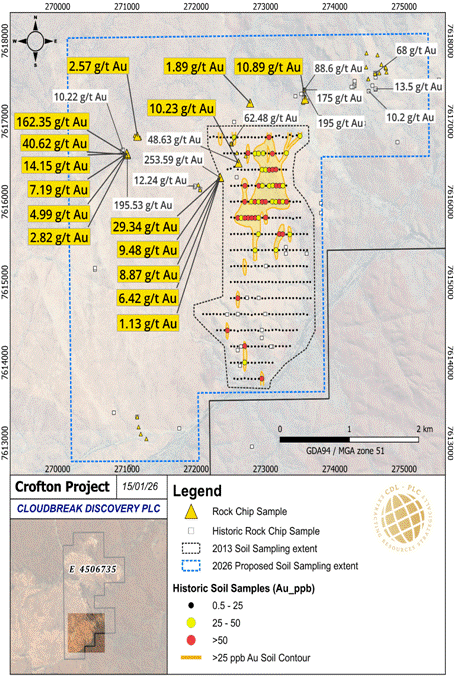 Tom Evans, Cloudbreak's Managing Director, commented: "It is fantastic to see these outstanding results from the maiden site trip to Crofton in Western Australia, with gold assays up to 162.35 g/t. Extra grades for the silver and multi-element assays are still in process and we anticipate that these can be reported in the coming weeks. Company geologists observed the presence of substantial quartz veins outcropping at surface over hundreds of metres of strike and tens of metres wide in the areas chipped sampled, adds to the prospectivity of this very exciting project. Crofton is an incredibly exciting gold project in Western Australia for us and will be a real focus for us in 2026 as we grow our portfolio of gold assets in the area in a period of record gold prices and resurgent silver prices. Following on from our RNS dated 21 January, where we paid final consideration for ownership of our Darlot West gold assets and Crofton, I'm also very pleased to announce that existing institutional shareholders have today participated in an important £1.85m placing designed to strengthen our balance sheet for an active gold exploration push this year. This cash amount is equivalent to Australian $3.7m, which gives the Company of lot of exploration dollars on the ground in Australia and sees us well funded for the future.