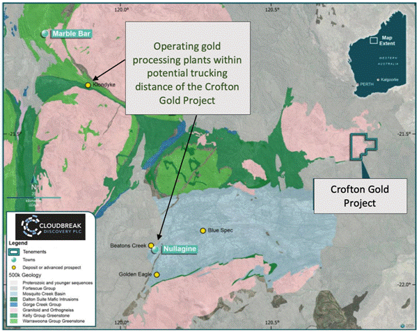 Cloudbreak Discovery Plc (LSE: CDL), a London Stock Exchange Main Market listed company, is pleased to announce that gold assay results up to 162 grams per tonne of gold (g/t Au), equivalent to 5.22 oz/t Au have been received from the maiden site visit to the Crofton Gold Project ("Crofton"). Crofton is located 120 kilometres east-southeast of the famous Australian gold mining centre of Marble Bar and 75km northeast of the mining centre town of Nullagine, in the Pilbara region of Western Australia (Figure 2). Multi-element results are still being processed at the assay laboratory and are anticipated to be received in the coming weeks.