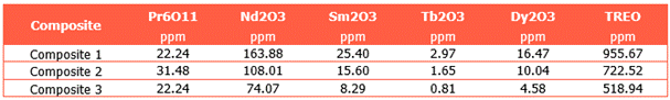 · A sample composite from drillholes IR275 and IR276 with a composite grade of 977ppm Total Rare Earth Oxide ("TREO") (160ppm Neodymium ("Nd") + Praseodymium ("Pr") and 17ppm Dy +Tb) yielded diagnostic recoveries of: