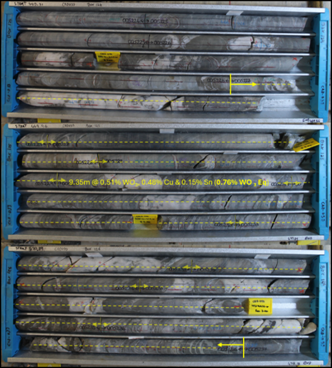· 9.35 m @ 0.51% WO3, 0.48% Cu & 0.15% Sn (9.35m @ 0.76% WO3 Eq.) from 468.65 m, including (see Figure 1):