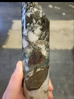 Figure 5: Example of chalcopyrite (copper) in mineralised exploration drill core from drill hole CRD041, as logged & sampled by CRL geologists.