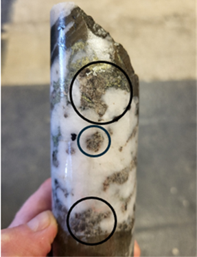 Figure 1: Example of fine cassiterite (tin) (circled) and chalcopyrite (copper) and wolframite (tungsten) in drill core from drill hole CRD041, within a new zone of mineralisation, as logged & sampled by CRL geologists.