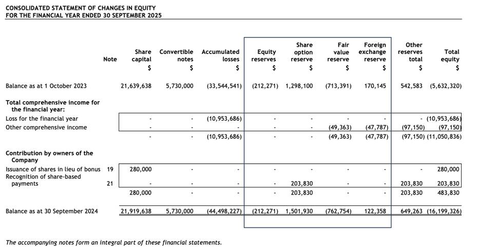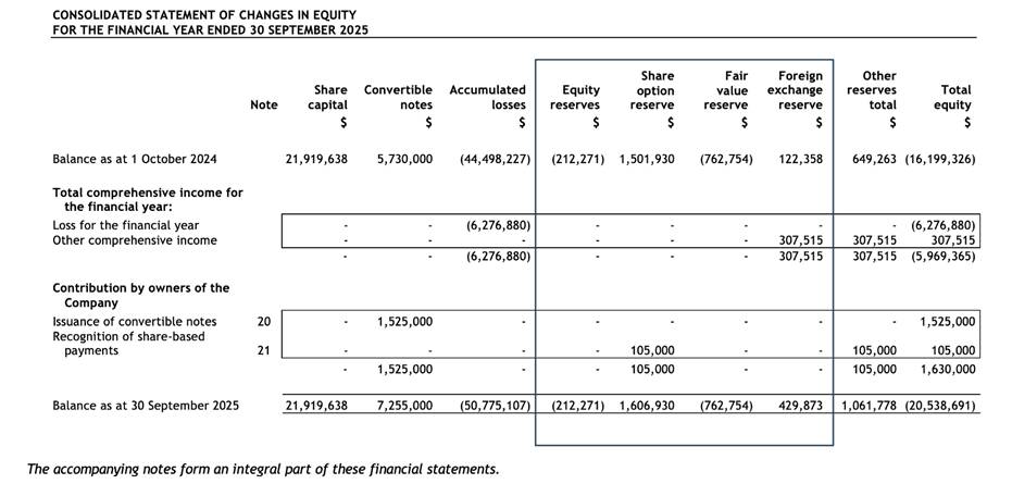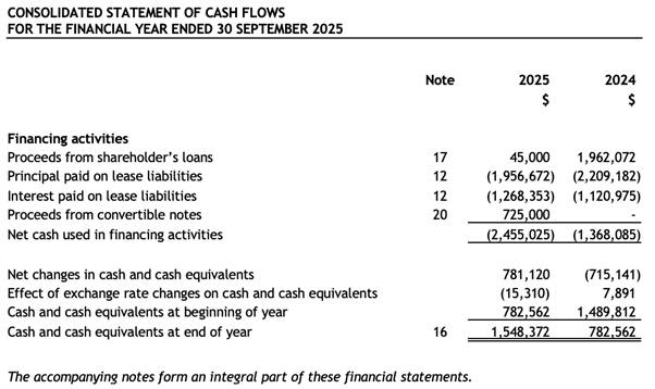 · The Group maintained a $4.5 million loan facility with MACAN, the Group's largest shareholder. During FY25, $45k was drawn down. As of the report date, $0.8 million remains available to the Group.