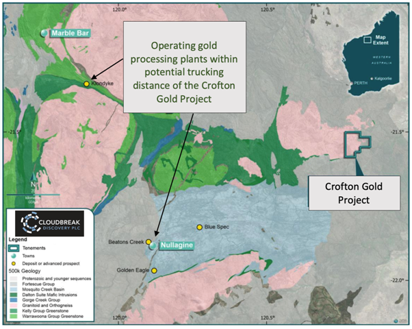 Cloudbreak Discovery Plc (LSE: CDL), a London Stock Exchange Main Market listed company, is very pleased to announce that further gold assay results up to 142 g/t Au (or 4.5 ounces per tonne gold) and along with silver results up to 175g/t Ag (or 5.6 ounce per tonne silver) have now been recieved from multi-element assay and fire assay, from the site visit to the Crofton Gold Project ("Crofton"). Crofton is located 120 kilometres east-southeast of the famous Australian gold mining centre of Marble Bar and 75km northeast of the mining centre town of Nullagine, in the Pilbara region of Western Australia (Figure 1).