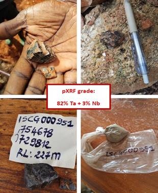 · Coltan occurrences showing the presence of tantalite endmember in grab samples (82% Ta) using portable X-ray Fluorescence device (pXRF) were also identified within the same discovery trench.