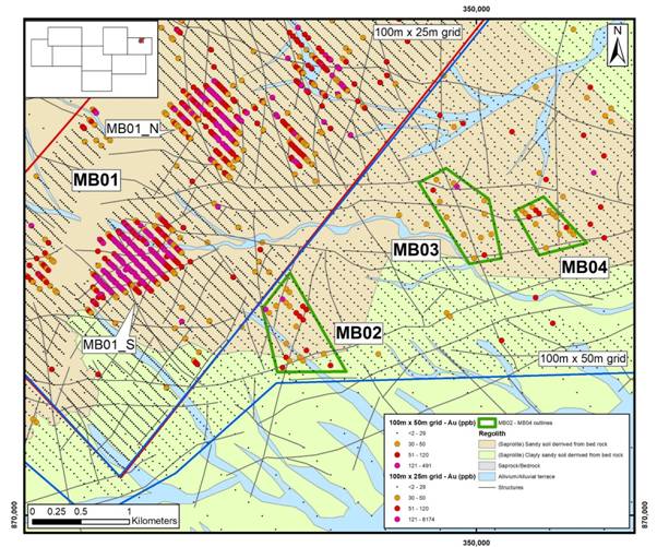 Figure 3. Results from 2021-2024 soil sampling programmes at Mbe, showing the location of prospects MB01 (including MB01-N target and MB01-S deposit), and MB02 to MB04