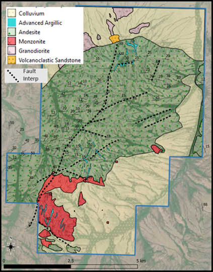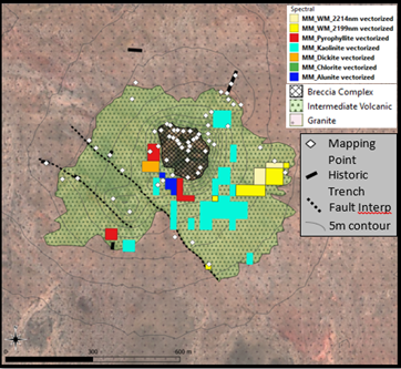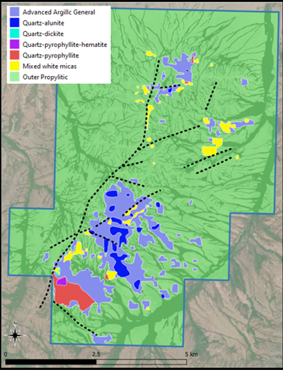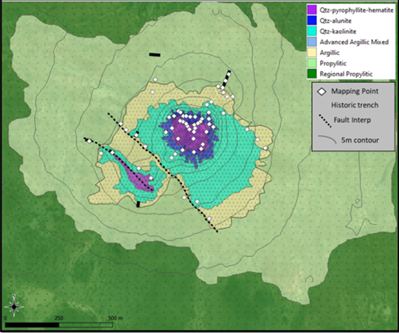 2. Extensive alteration: Piket displays extensive argillic alteration in the north and the south and at least two areas of extensive alunite veining have been observed through the mapping. Alteration is strongest in the southern part of the license area with extensive quartz-pyrophyllite alteration observed at surface. Pyrophyllite is diagnostic of the higher temperature parts of the porphyry lithocap environment and is used a key vector to the hottest and therefore most prospective parts of the system.