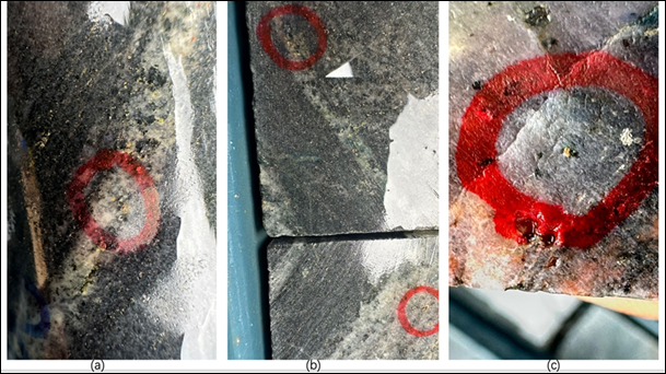 Figure 2: Visible gold (circled in red) captured at 51m (a), 60.95m (b) and 132m (c) from hole FADD25-001