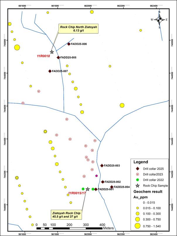 Holes FADD-005 (100.20m) and FADD-006 (in progress) and 007 are located some 500m to the north of the Ziatoyah discovery and are testing a new area where artisanal gold mining coincides with strong geochemical soil anomalies and a surface rock sample assay that returned a grade of 6.13g/t Au (Figure 3).