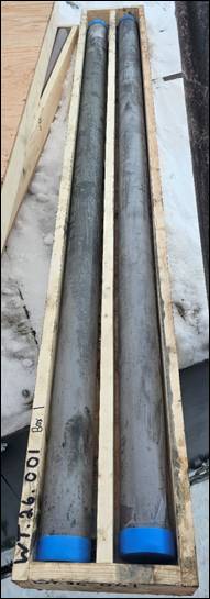 | Left: Photo of HQ (63.5mm) diameter, clear plastic sample collection cylinders containing tailings material from Vibracore hole WT-26-001 |